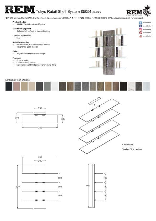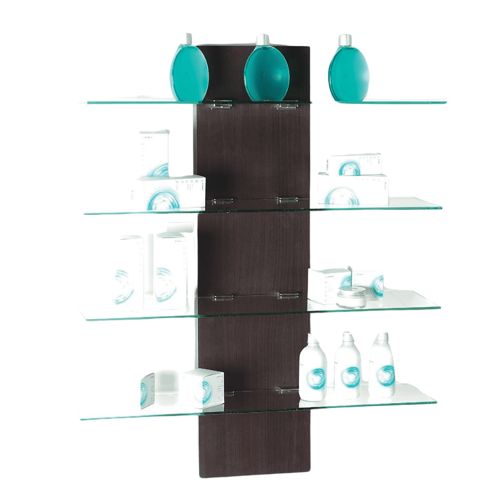 A simple and precise design, Tokyo Display Unit allows for the quick and easy display of products. This retail shelf system is wall mounted, available in 20 laminate choices and adds quality to your retail area. The shelves are made out of toughened glass with chrome supports.